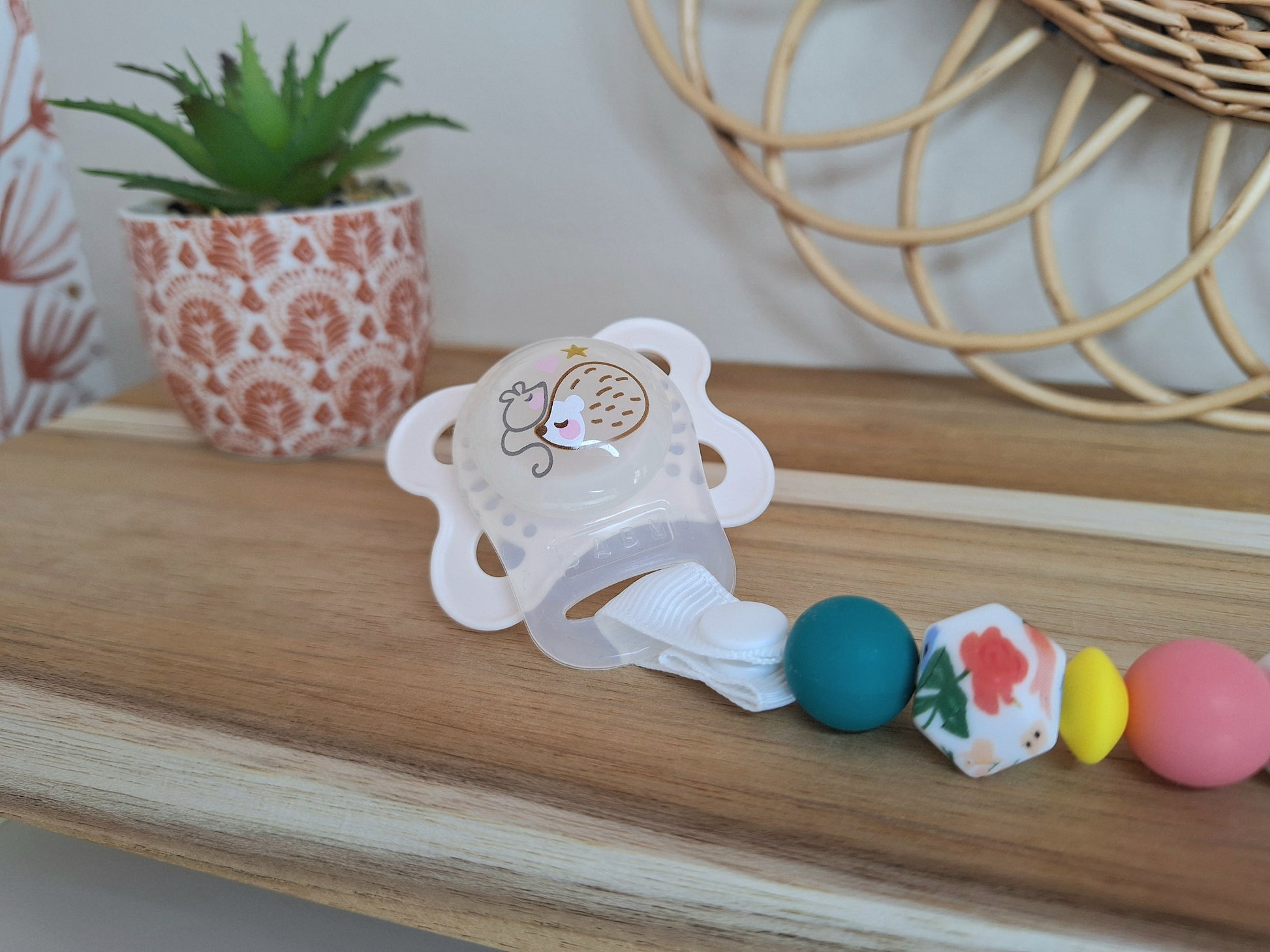 Pensez à indiquer le prénom ou le mot désiré, avec ou sans adaptateur pour les tétines sans anneaux, avant l’ajout au panier ✨