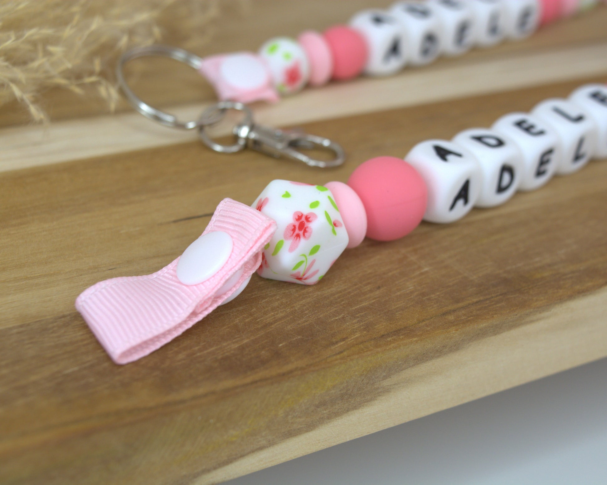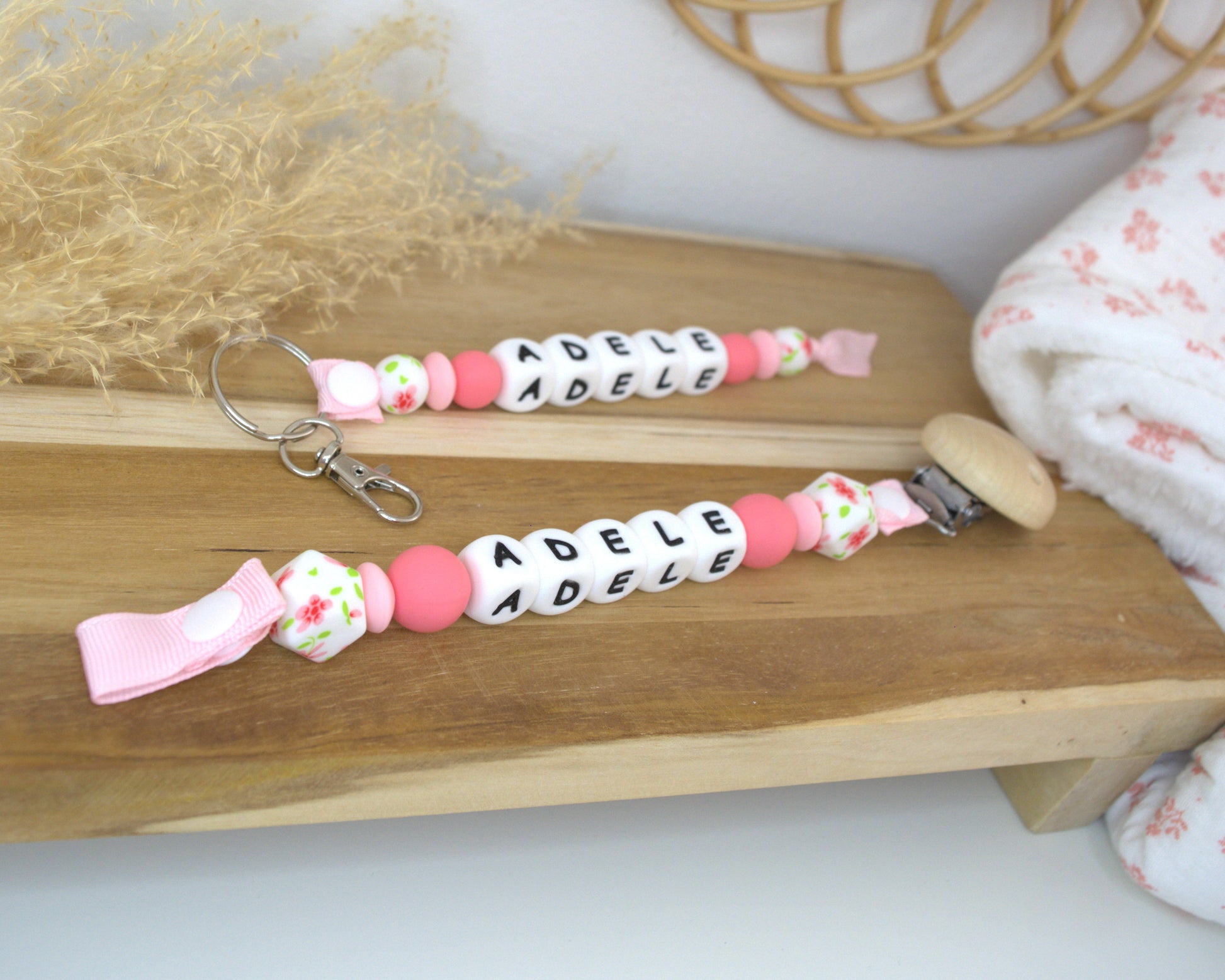 Un joli set composé d’une attache tétine classique pour bébé et d’un porte-clés coordonné pour maman ou papa, à emporter partout avec soi.